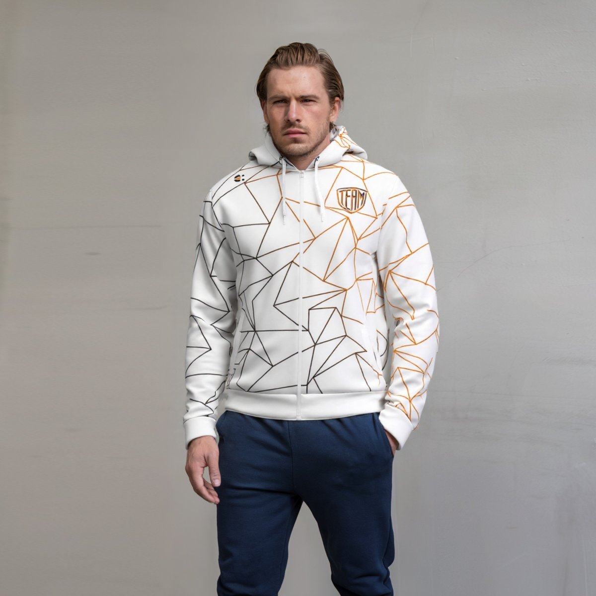 Giacca tuta zip e cappuccio in sublimazione. Unisex. Tessuto leggermente garzato idoneo a tutte le stagioni. Colore laccio cappuccio a scelta. Costina ai polsi ed in vita con colore a scelta. Tessuto: Micropiquet. 100% poliestere 240 grammi Taglie: da 7XS a 5XL