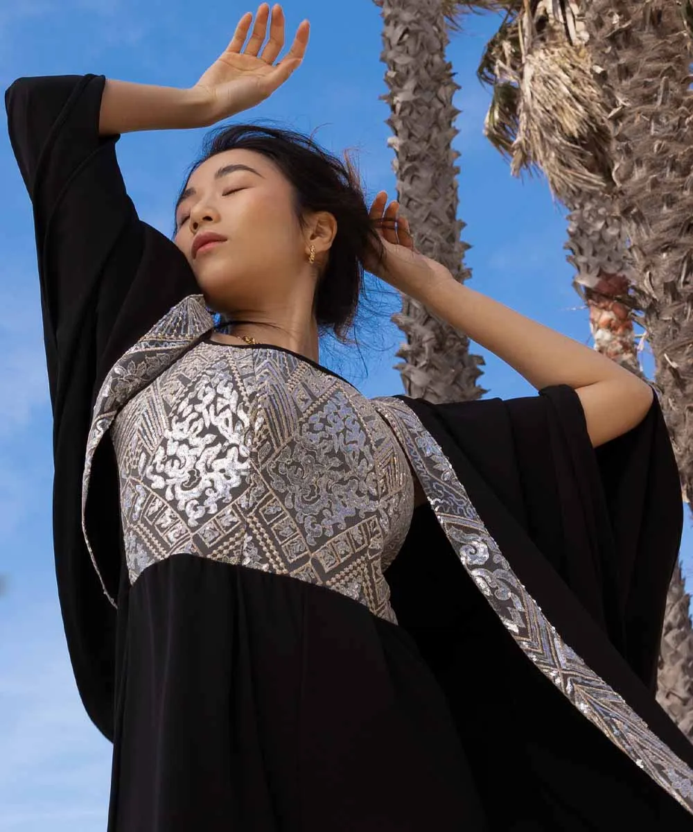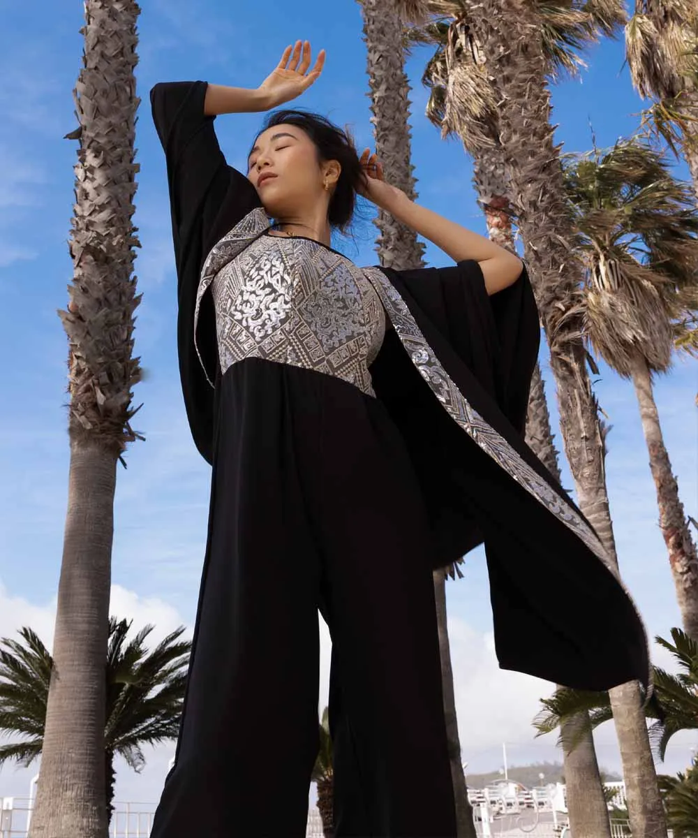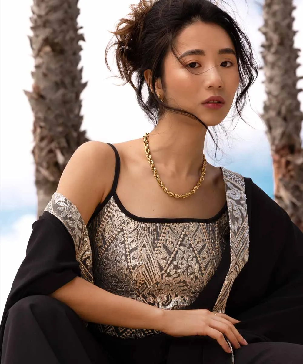 Salopette lunga estiva con bustier ricamato con micro-paillettes e filo 3D, per accompagnarti alle cerimonie o agli eventi più esclusivi.
