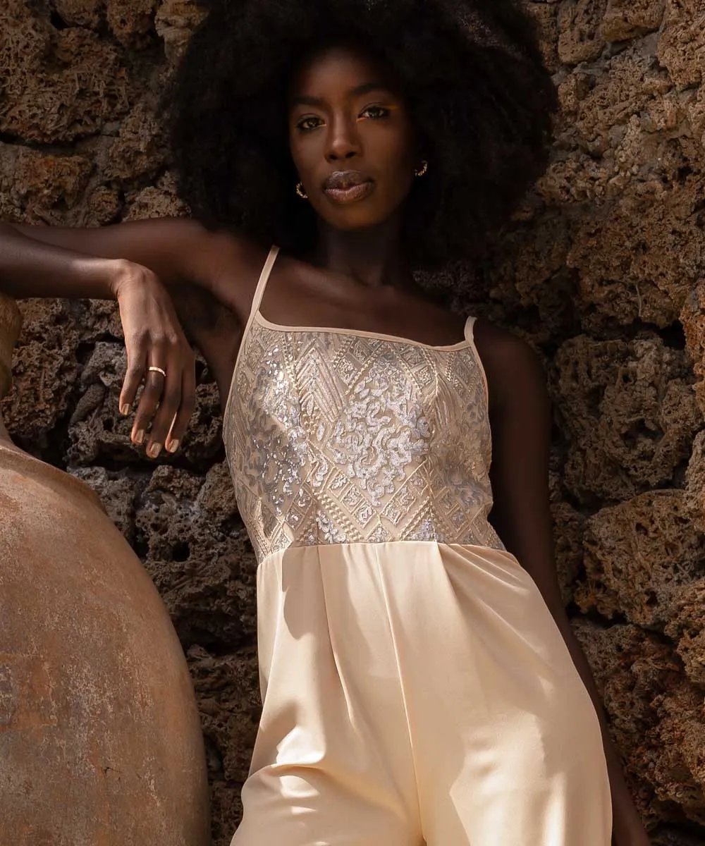 Salopette lunga estiva elegante, con bustier ricamato in micro-paillettes scintillanti, sia che tu sia invitata a una cerimonia, sia che tu sia la protagonista di un evento speciale.